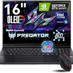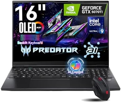 • acer Predator Helios Neo 16S AI Gaming Laptop, Intel Core Ultra 9 (Up to 5,4 GHz), NVIDIA GeForce RTX 5070Ti, 16″ OLED 240Hz, 64GB DDR5, 8TB SSD, Backlit Keyboard, Windows 11 Pro, Obsidian Black